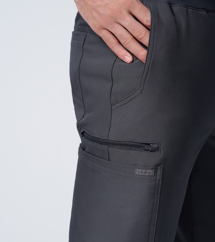 Details: 2 cargo pockets, 1 zipper pocket, 2 front pockets, 2 back pockets, rib-knit waistband with convertible drawcord, rib-knit leg cuffs.
