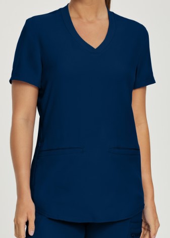 Neckline badge loop and curved hemline